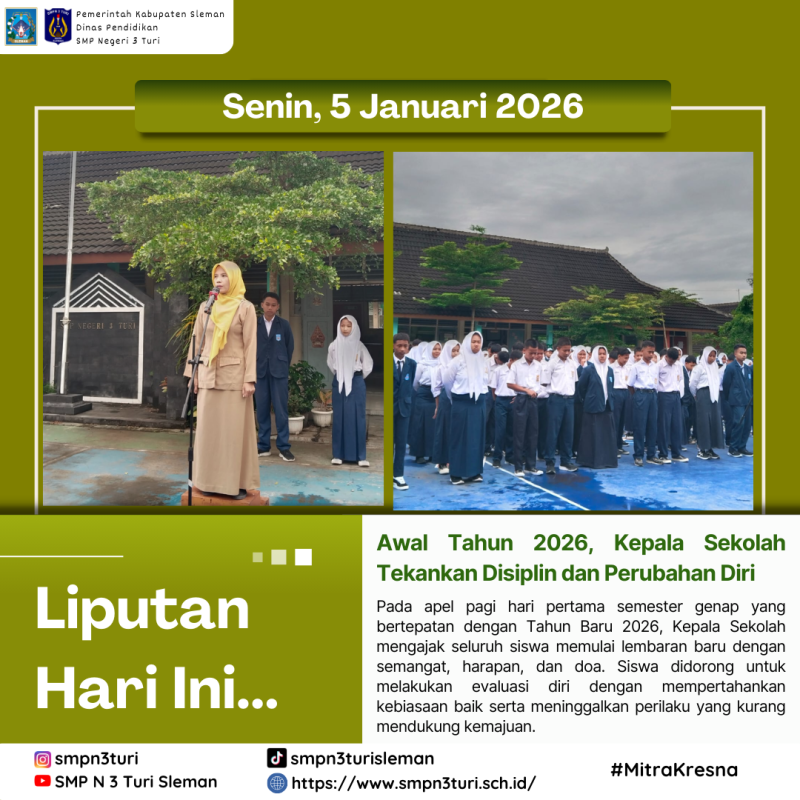 Turi, 5 Januari 2026 – Memasuki hari pertama sekolah di semester genap yang bertepatan dengan momentum Tahun Baru 2026, suasana penuh optimisme menyelimuti halaman sekolah pagi ini. Dalam amanatnya pada apel pagi, Kepala Sekolah menyampaikan pesan mendalam mengenai perubahan diri dan pentingnya kedisiplinan sebagai kunci kesuksesan. Harapan dan Doa di Tahun yang Baru.