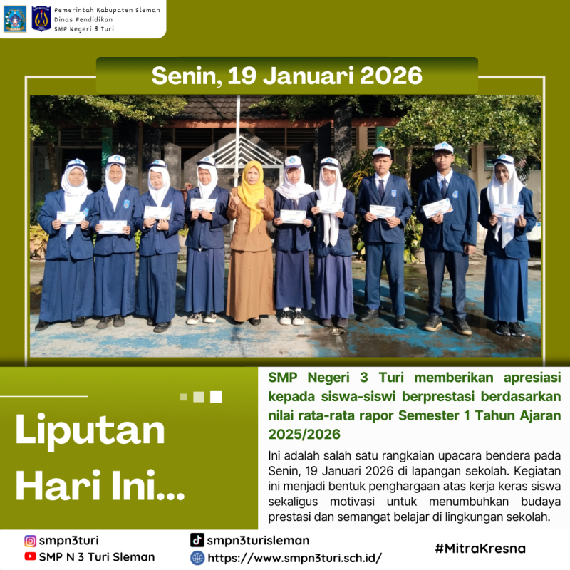 Turi, 19 Januari 2026 - SMP Negeri 3 Turi memberikan apresiasi kepada siswa-siswi berprestasi berdasarkan nilai rata-rata rapor Semester 1 Tahun Ajaran 2025/2026. Kegiatan ini dilaksanakan dalam rangkaian upacara bendera pada Senin, 19 Januari 2026, bertempat di Lapangan SMP Negeri 3 Turi.