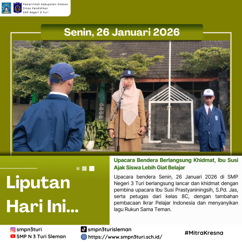 Turi, 26 Januari 2026 - Seperti biasa rutinitas setiap hari senin. Seluruh Guru, Karyawan, dan Peserta didik kelas 7,8, dan 9 mengikuti upacara benderah di lapangan sekolah tercinta. Pada kesempatan tersebut, Ibu Susi Prastyaniningsih, S.Pd. Jas bertindak sebagai pembina upacara dengan petugas upacara dari kelas 8C.