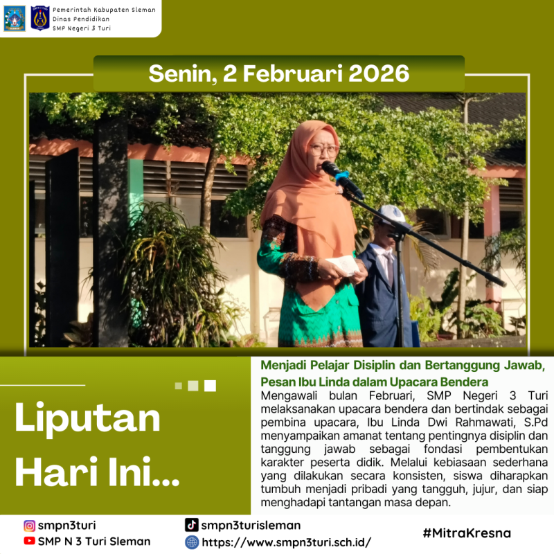 Senin, 2 Febaruari 2026 - Mengawali bulan februari ini SMP Negeri 3 Turi melaksanakan kegiatan Upacara Bendera yang dilaksanakan di lapangan sekolah dan berlangsung dengan tertib dan khidmat. Bertindak sebagai pembina upacara yaitu Ibu Linda Dwi Rahmawati, S.Pd menyampaikan amanat yang sarat dengan pesan pembentukan karakter, khususnya mengenai pentingnya disiplin dan tanggung jawab bagi peserta didik.