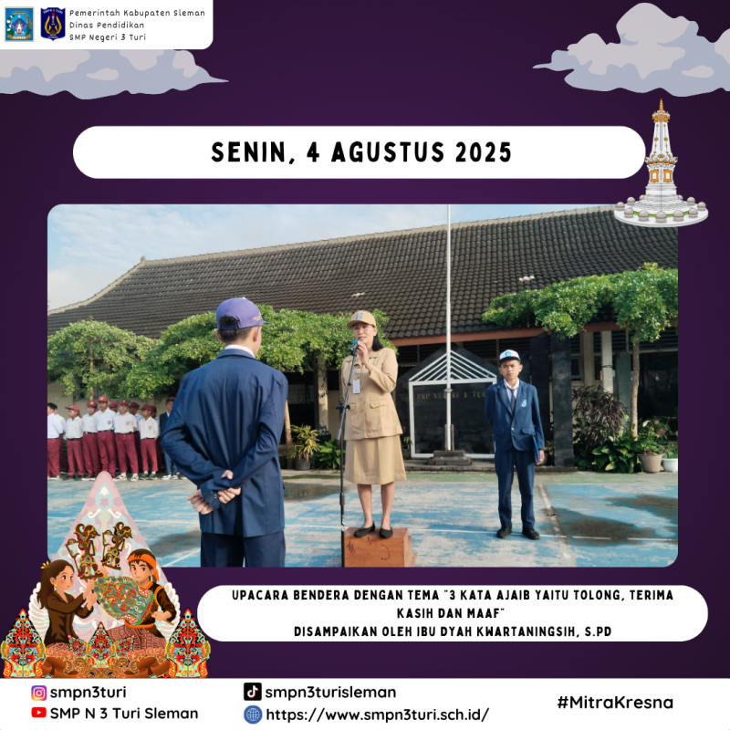 Dengan tema yang inspiratif dan pelaksanaan yang tertib, upacara bendera kali ini menjadi momentum penting untuk terus menanamkan nilai-nilai positif di lingkungan SMP Negeri 3 Turi.