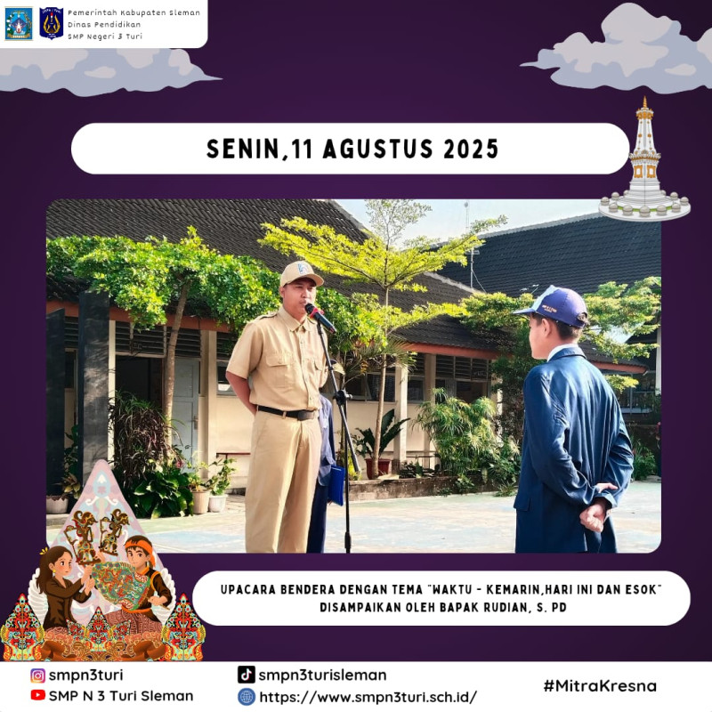 Pagi yang cerah mengiringi pelaksanaan upacara bendera di SMP Negeri 3 Turi pada Senin, 11 Agustus 2025. Seluruh siswa, guru, dan karyawan berdiri tegak di lapangan, mengikuti rangkaian upacara yang dipimpin petugas dari kelas IX D. Bertindak sebagai pembina upacara adalah Bapak Rudian, S.Pd, yang kali ini membawakan amanat penuh makna tentang “Waktu”.